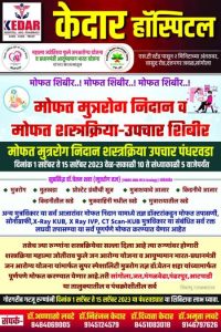 मिरज-सांगली मधील सुप्रसिद्ध मूत्ररोग तज्ञ डॉ.चेतन शहा यांच्या सहकार्याने दि.१ सप्टेंबर ते १५ सप्टेंबर दरम्यान सकाळी १० ते सायंकाळी ५ वाजेपर्यंत हे मोफत मुत्ररोग निदान व मोफत शस्त्रक्रिया उपचार शिबीर आयोजित करण्यात आले आहे.सदर शिबिरामध्ये मूत्ररोग,मुतखडा, प्रोस्टेट ग्रंथीची सूज,मूत्राशयाचे आजार,किडनीचे आजार, किडनीवरील सूज,किडनीतील खडे,मूत्रवाहिनी मधील खडे,मूत्राशयातील खडे,लघवी संबंधितील आजार-लघवी वारंवार होणे,स्त्री व पुरुष यांच्या लघवीच्या मार्गातील अडथळे, लघवीच्या मार्गामध्ये पडदे तयार होणे,लघवी न होणे इ.आजारांवर मोफत तपासण्या केल्या जाणार आहेत.