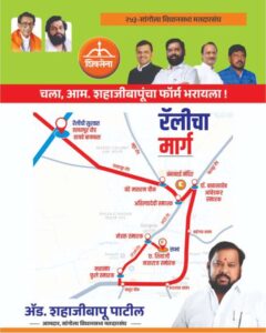 सांगोला विधानसभा मतदारसंघाचे शिवसेना शिंदे गटाचे उमेदवार ॲड.शहाजीबापू राजाराम पाटील यांचा उमेदवारी अर्ज भरण्यापूर्वी सोमवारी २८ ऑक्टोबर रोजी सकाळी १० ते दुपारी ३ या वेळेत मोटरसायकल रॅली व सभेचे आयोजन करण्यात आले आहे.