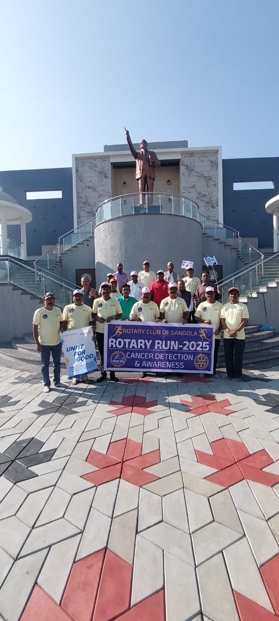 सांगोला रोटरी क्लबच्या वतीने कर्करोग तपासणी व याबाबत जनजागृतीसाठी शनिवारी संपूर्ण शहरातून ‘रोटरी रन-२०२५’ ही रॅली काढण्यात आली होती.समाजाला आरोग्य जनजागृतीचा संदेश देणाऱ्या ‘रोटरी रन-२०२५’ या उपक्रमाची सुरुवात शहरातील महात्मा फुले यांच्या पुतळ्यास रो.डॉ.संदीप देवकते यांच्या हस्ते पुष्पहार अर्पण करुन करण्यात आली.